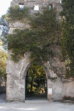 | Through this arch is the path that leads to the lecture hall where we held our meetings and the beautiful Rufolo gardens. | This construction worker unhooks a bucket as he helps get the building ready for the year 2000 Jubilee. |